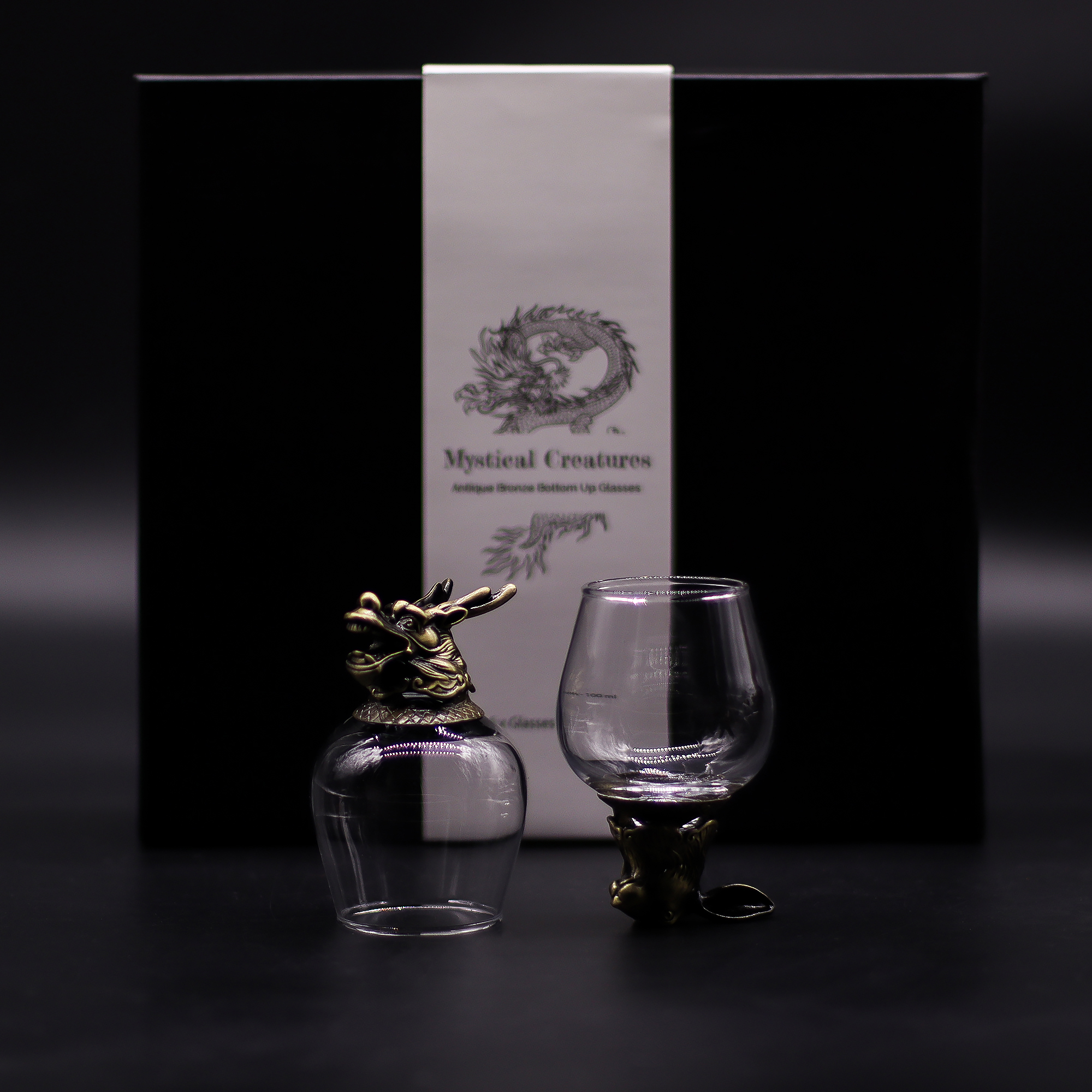 Svaka čašica ima teško mesingano postolje oblikovano u mitska bića poput zmaja, kobre, tigra, slona, koze i ovna – prekrasno detaljno izrađeno i puno karaktera. Kada se okrenu naopako, figura se u punom sjaju otkriva, pretvarajući svaki komad u malo umjetničko djelo.