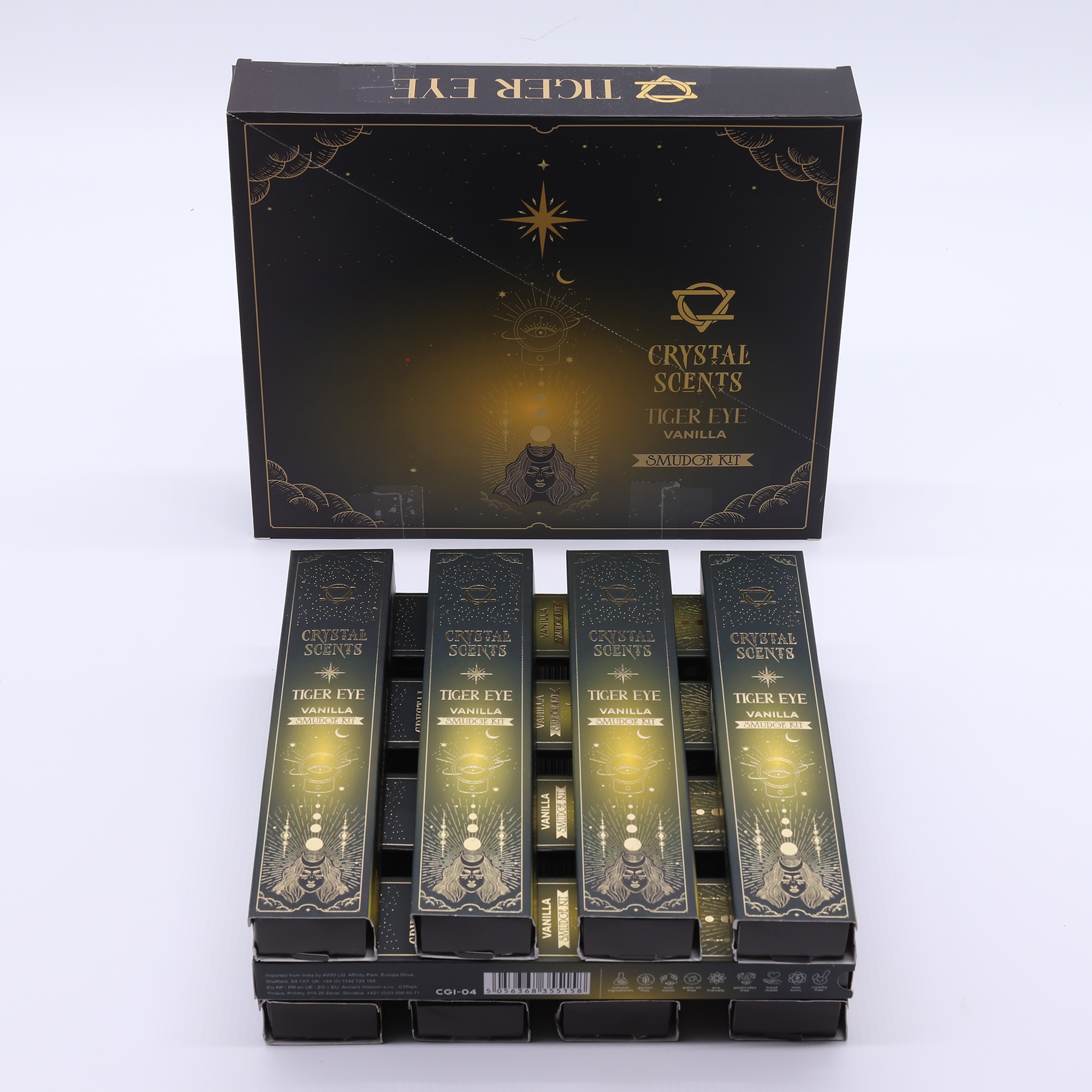 Svaki set sadrži 10 ručno izrađenih mirisnih štapića i pravi kristal tigrovog oka, što ga čini atraktivnim za trgovine koje nude wellness proizvode, spiritualne poklone ili alate za postavljanje namjera. Kombinacija je pogodna i za mirne, svakodnevne rituale i za strukturirane manifestacijske prakse.