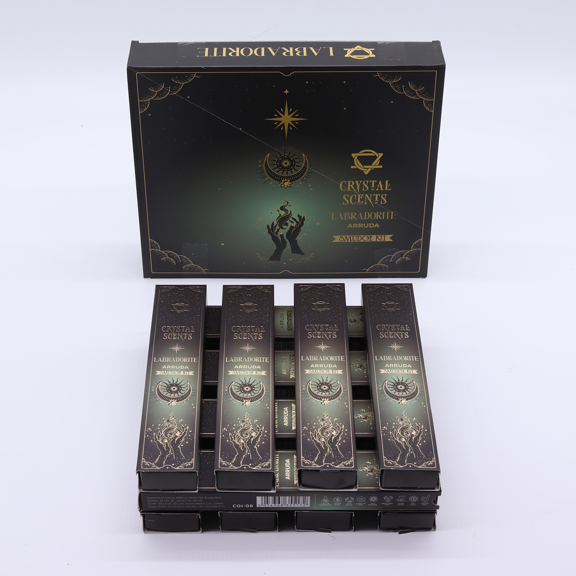 Svaki set sadrži 10 ručno izrađenih mirisnih štapića i pravi kristal labradorita, što ga čini idealnim za spiritualne dućane i trgovine usmjerene na wellness. Kupci često biraju ovu kombinaciju u periodima promjena ili kada žele stvoriti intuitivan i uzemljen prostor.
