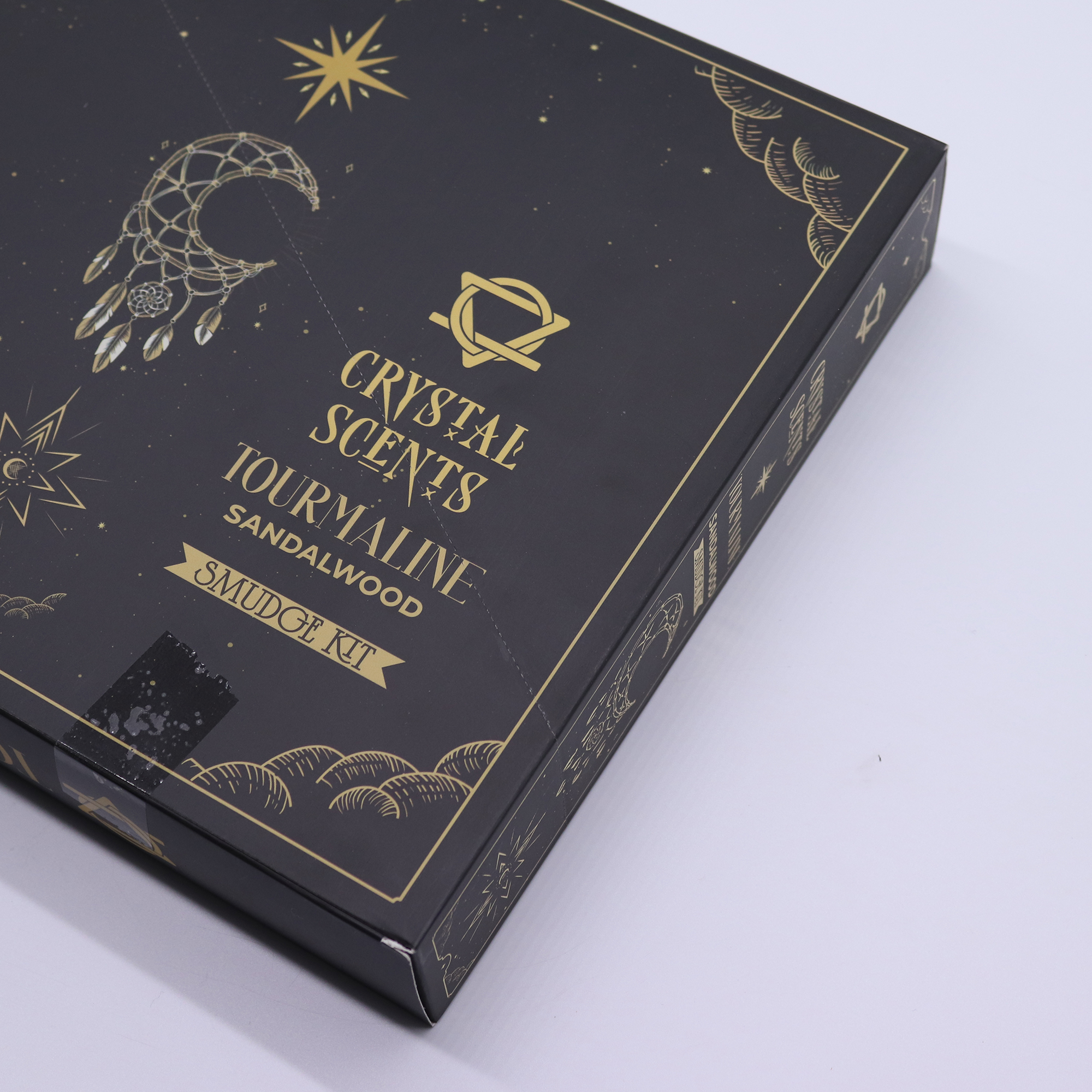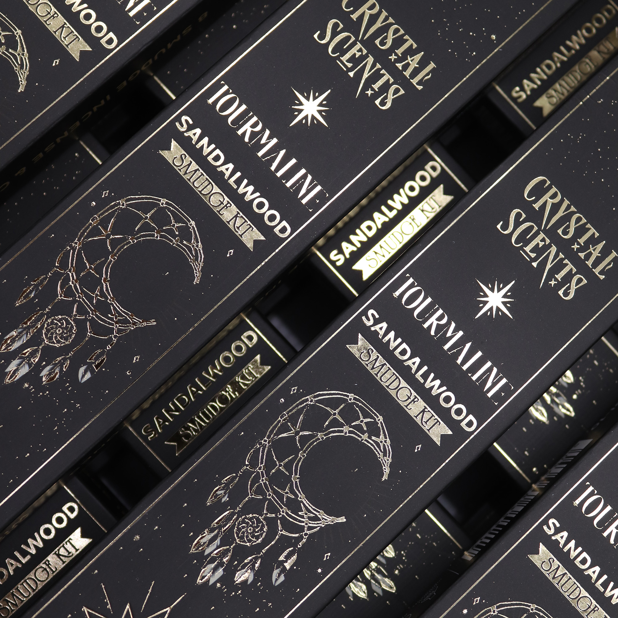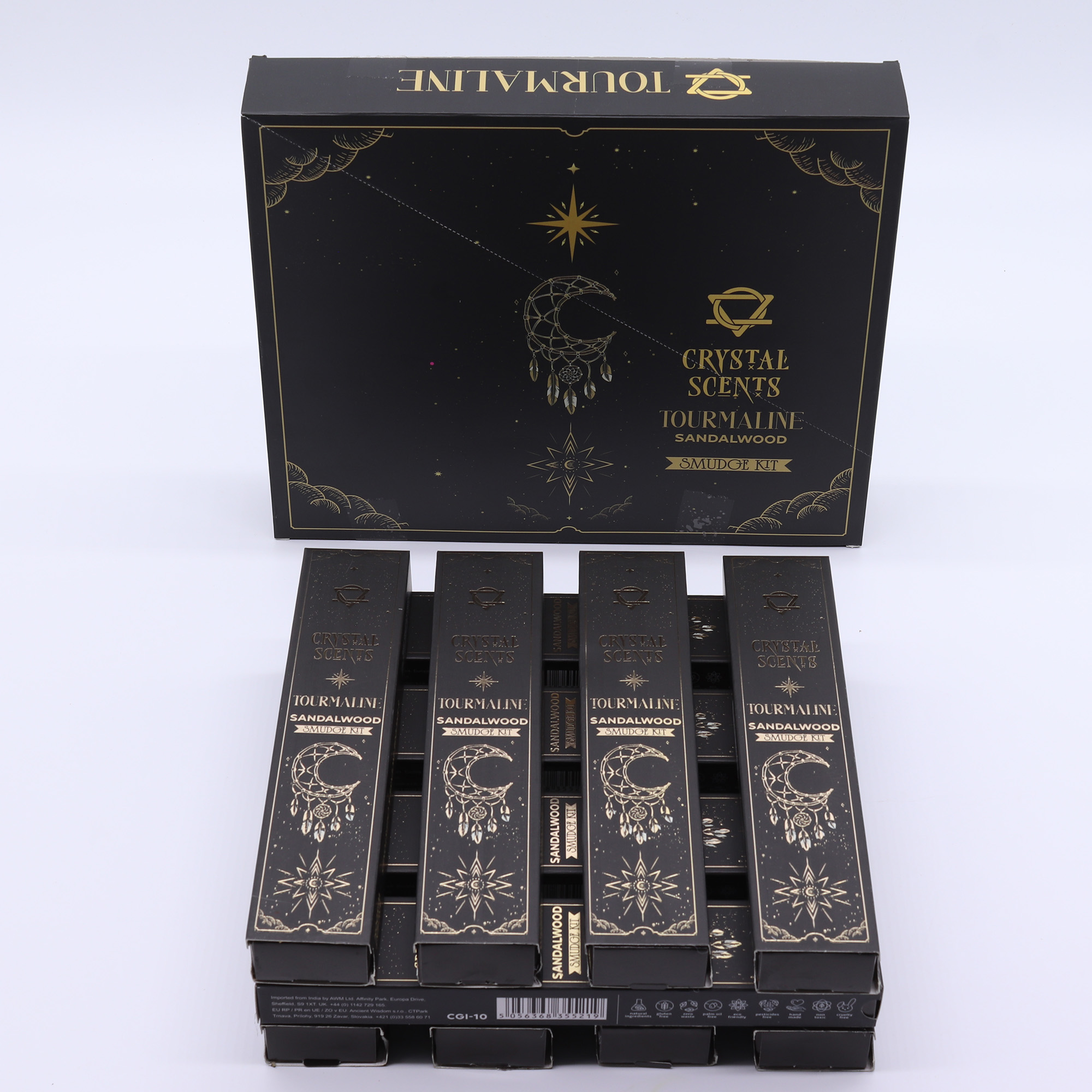 Svaki set sadrži 10 ručno izrađenih mirisnih štapića i pravi kristal turmalina, što ga čini izvrsnim izborom za dućane sa spiritualnim proizvodima, wellness trgovine i mjesta koja nude alate za ritualno uzemljenje ili čišćenje. Njegov duboki, umirujući miris privlačan je tijekom cijele godine.