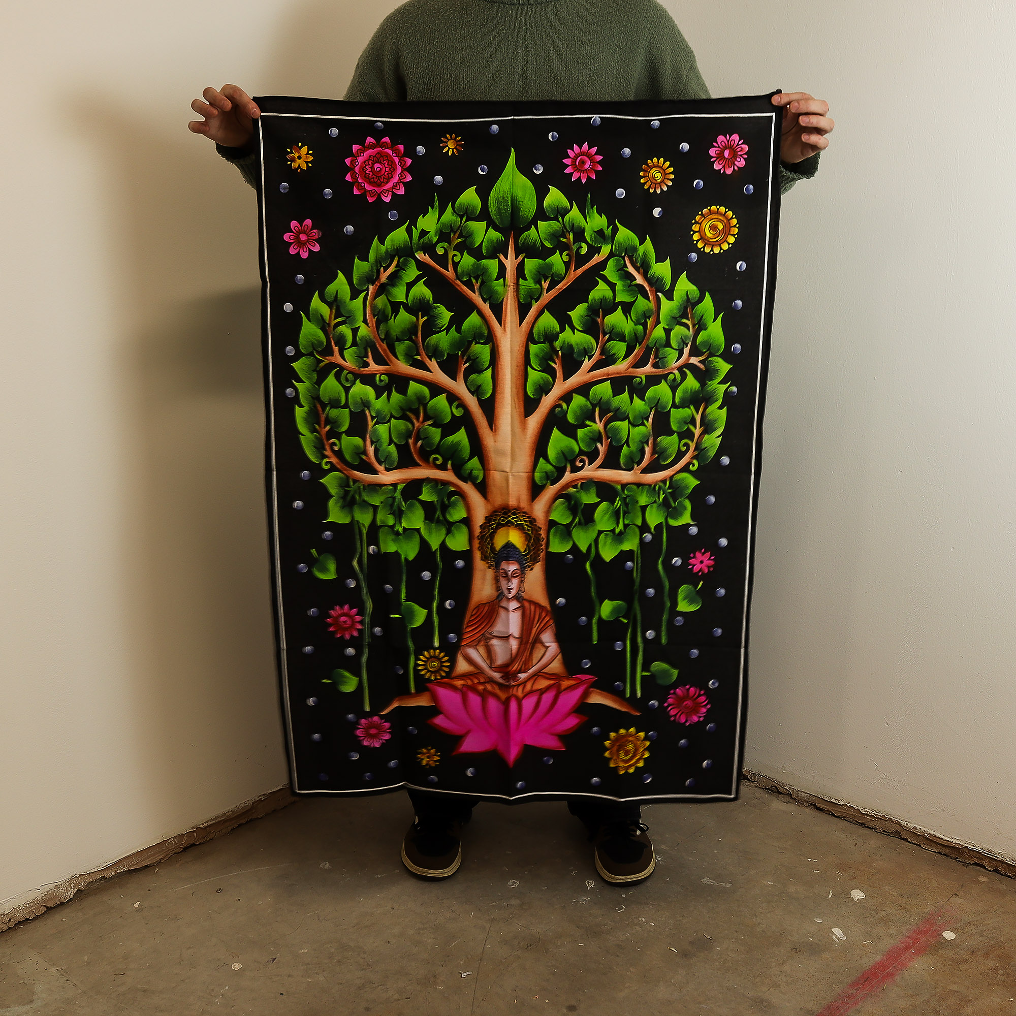 Ova smirujuća indijska zidna dekoracija prikazuje Budu kako meditira ispod stabla Bodhi, bezvremenski simbol prosvjetljenja i mira.