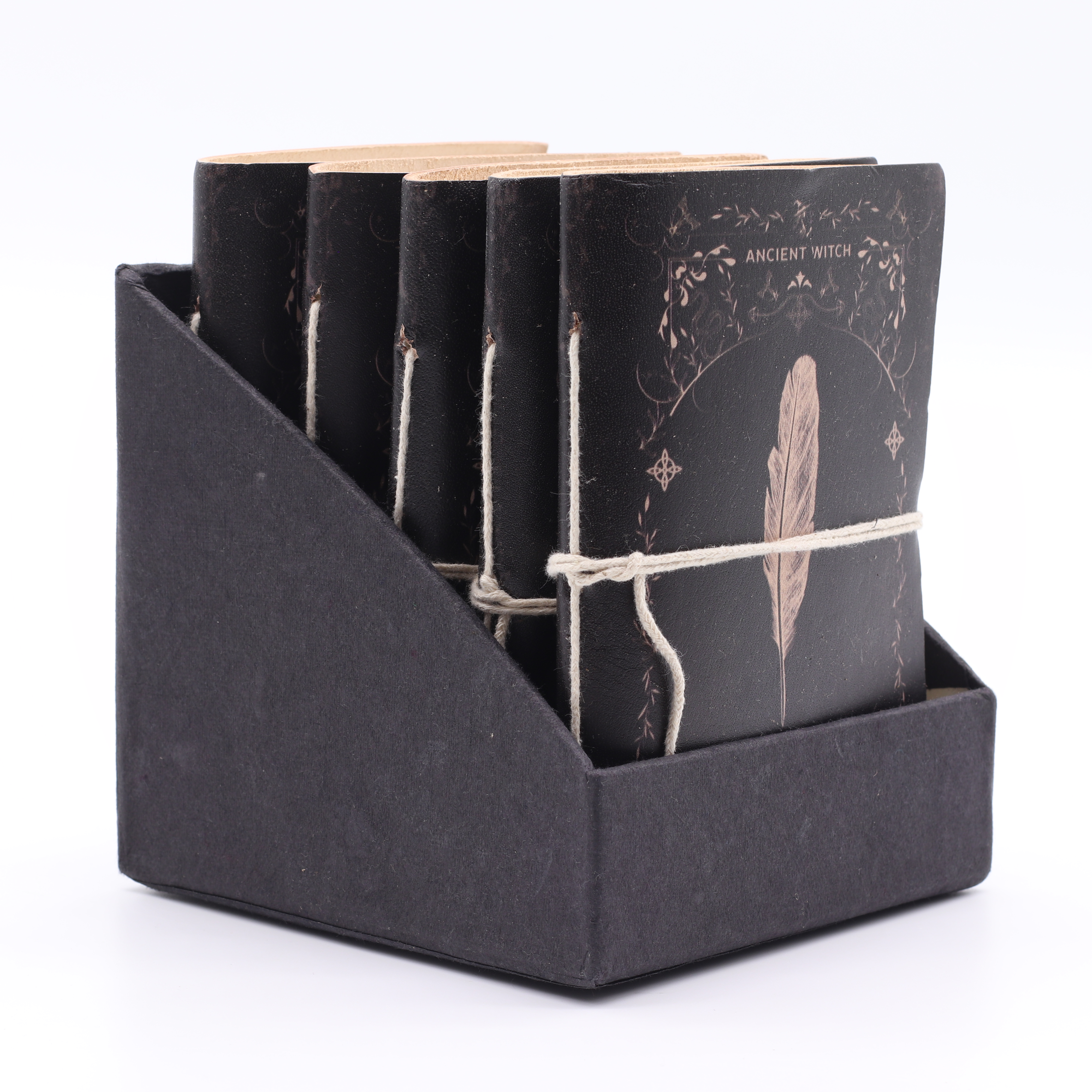 Asortiman dolazi u kutiji spremnoj za prodaju i savršeno funkcionira u metafizičkim trgovinama, gotičkim dućanima i prodavaonicama poklona s duhovnim ili boemskim prizvukom. Trgovci ih mogu istaknuti kao idealne bilježnice za čarolije, afirmacije ili osobne refleksije.