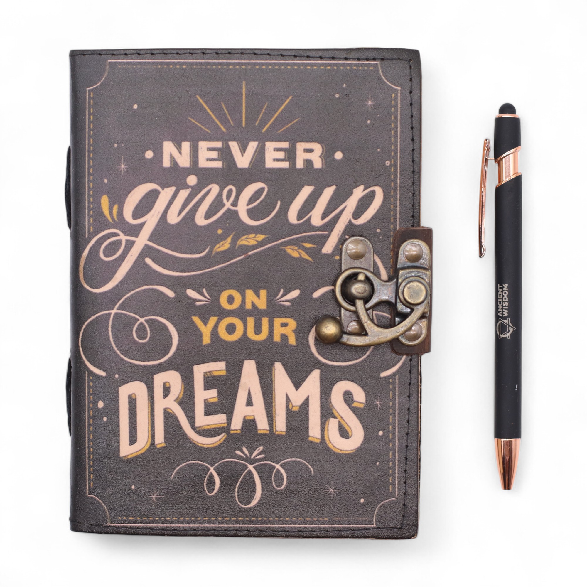 Odvažno, motivirajuće i moderno — ova tiskana kožna bilježnica nosi poruku koja odjekuje univerzalno: "Never Give Up On Your Dreams".