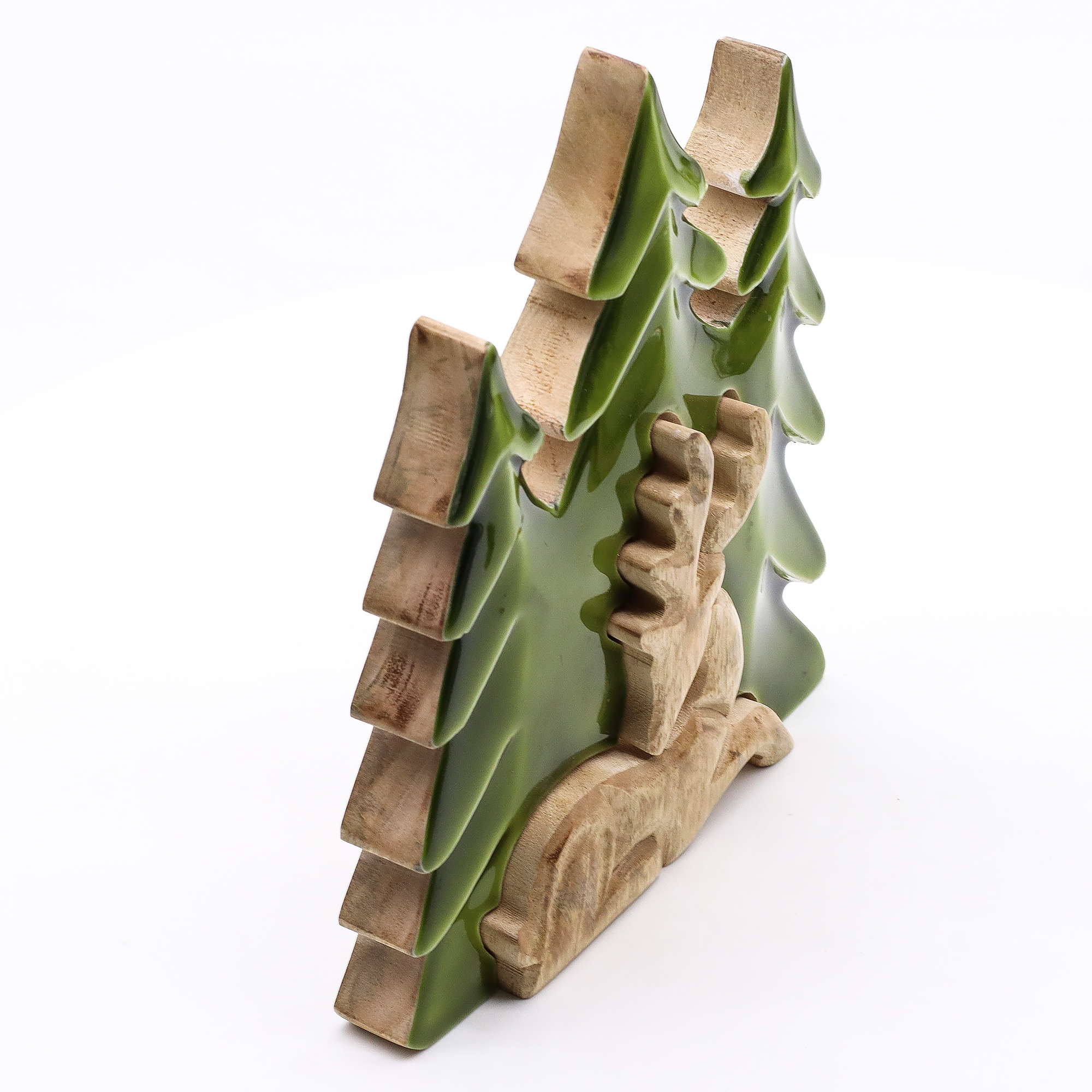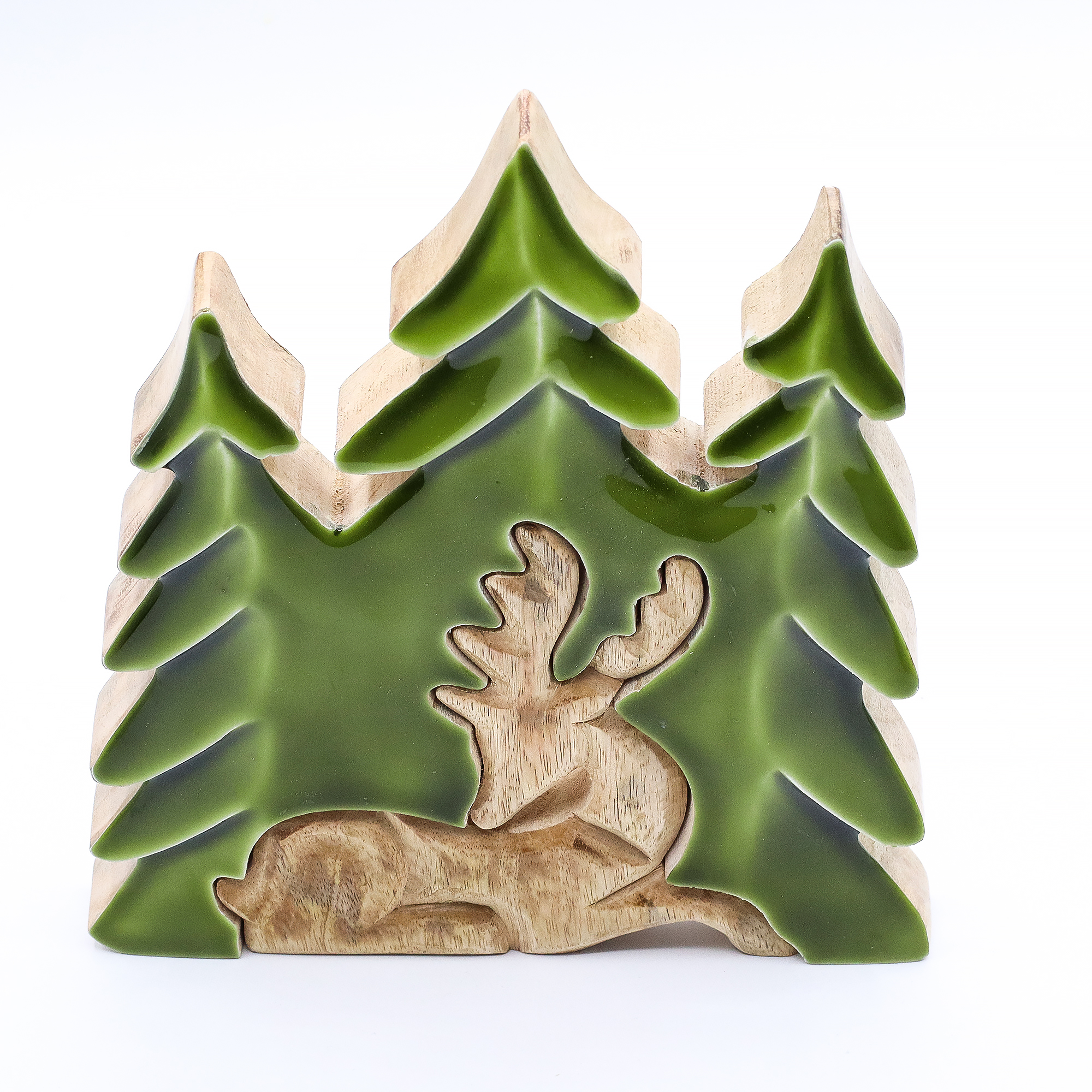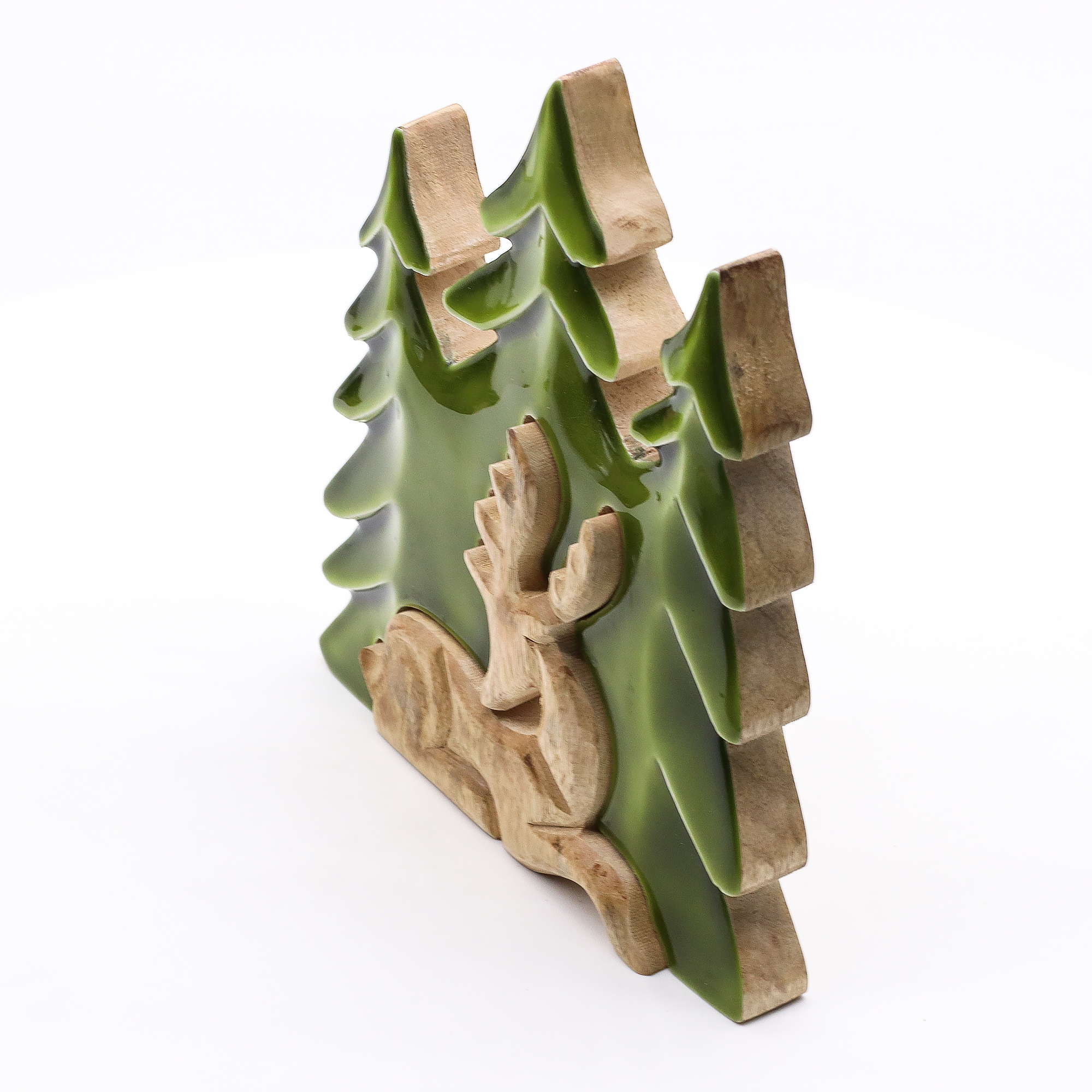 Ova impresivan 3D Drveni Ukras Jelen u Šumi prikazuje veličanstvenost šumskih divljih životinja. Ručno rezbareno u Indiji od održivog drveta manga, sadrži upečatljiv 3D prikaz jelena u šumskom okruženju. Završen bogatim, sjajnim emajlom, ovaj komad prekrasno spaja rustikalnu teksturu sa živopisnim zelenim naglascima, evocirajući dubinu prirode.