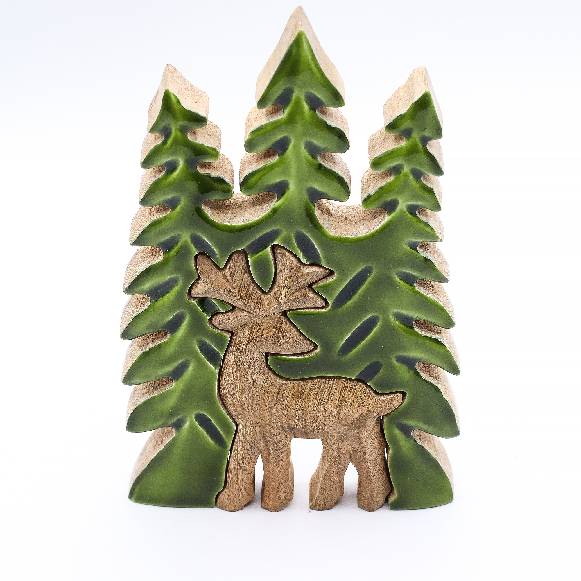 Ova impresivan 3D Drveni Ukras Jelen u Šumi prikazuje veličanstvenost šume. Ručno rezbareno u Indiji od održivog drveta manga, prikazuje upečatljivog 3D jelena u šumskoj sceni. S bogatom, sjajnom emajliranom završnom obradom, prekrasno spaja rustikalno drvo sa živopisnim zelenim detaljima, unoseći mir prirode u unutrašnjost.