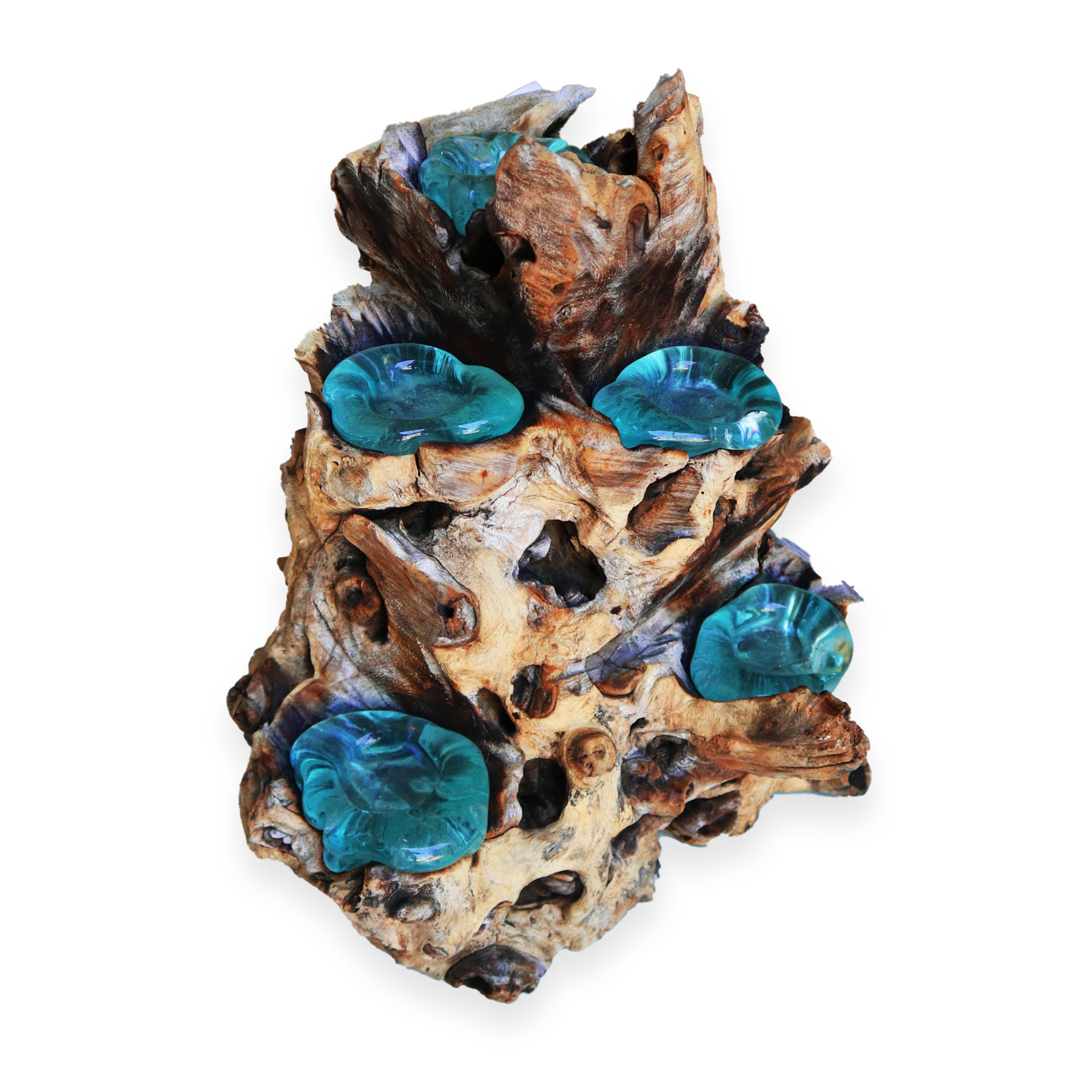 Prekrasan komad koji kombinira umjetnost rastopljenog stakla s prirodnim drvetom. Staklo je oblikovano prema drvenoj bazi, stvarajući jedinstvenu i privlačnu estetiku. Osigurava ambijentalno osvjetljenje i unosi dozu elegancije u prostor.