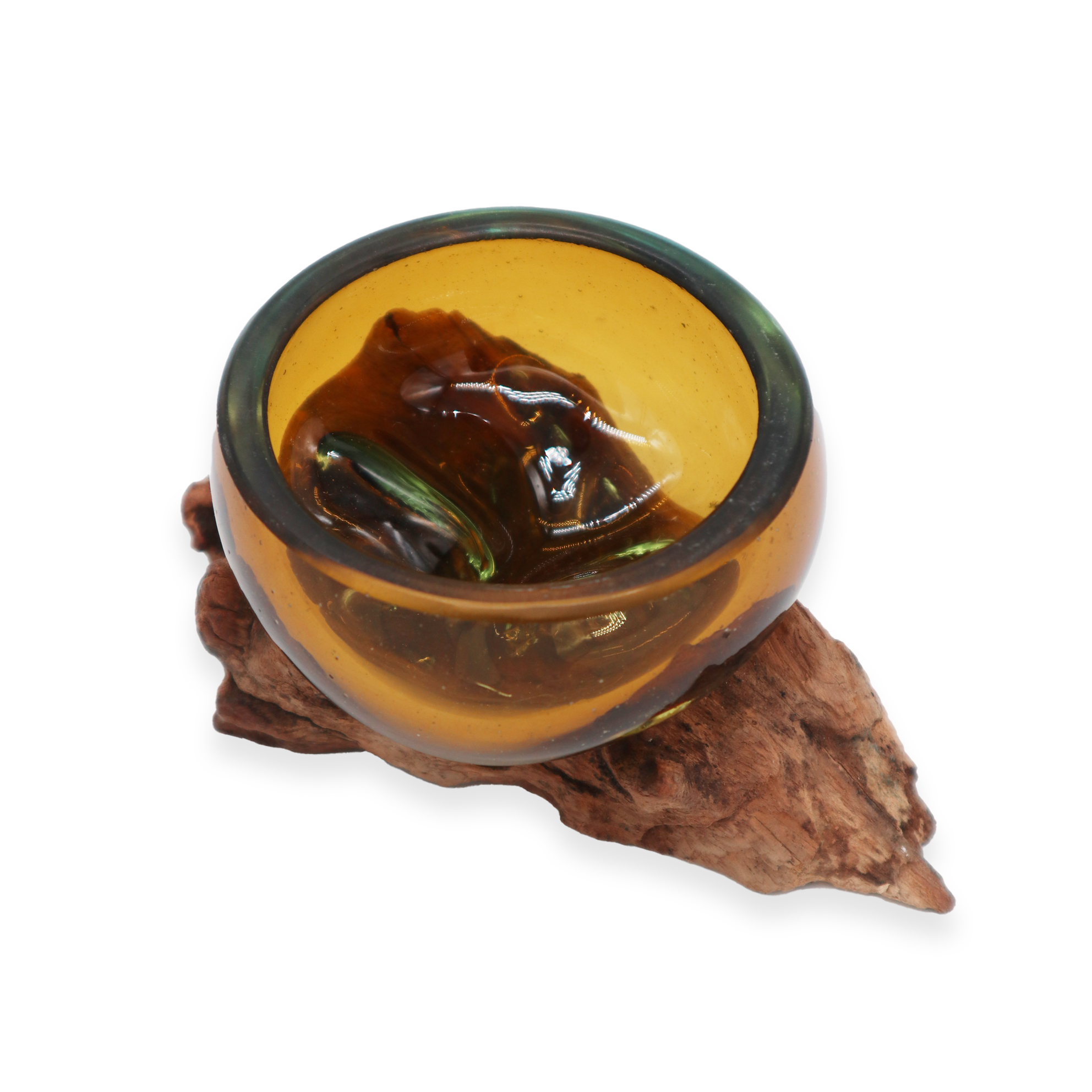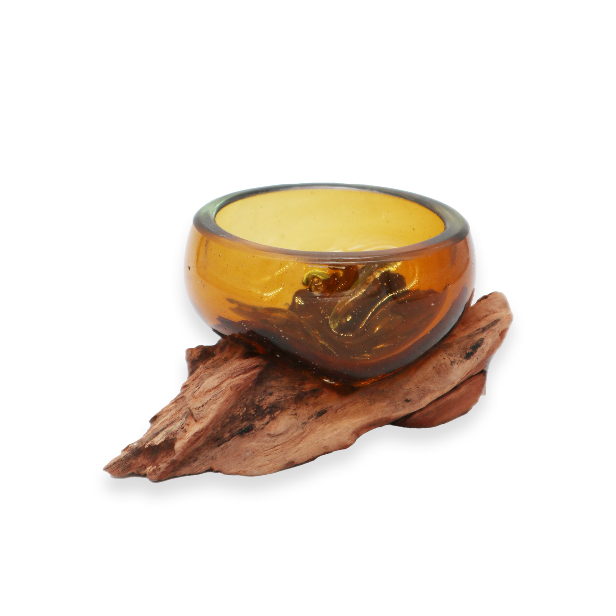 Jedinstven i atraktivan predmet koji kombinira topljeno staklo i prirodno gamal drvo. Ova zdjelica je ručno izrađena kombinacija stakla oblikovanog prema drvenoj osnovi. Njena jantarna nijansa stakla donosi toplinu i eleganciju. Može se koristiti kao ukrasni komad, držač za sitnice ili kao poseban poklon. Osim svoje estetike, zdjelica nosi autentičnost i karakter ručne izrade.