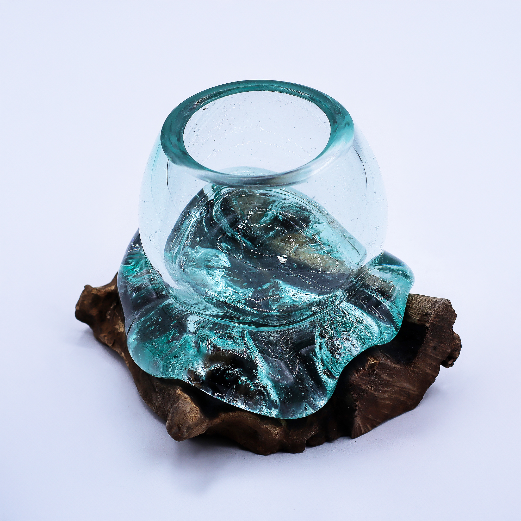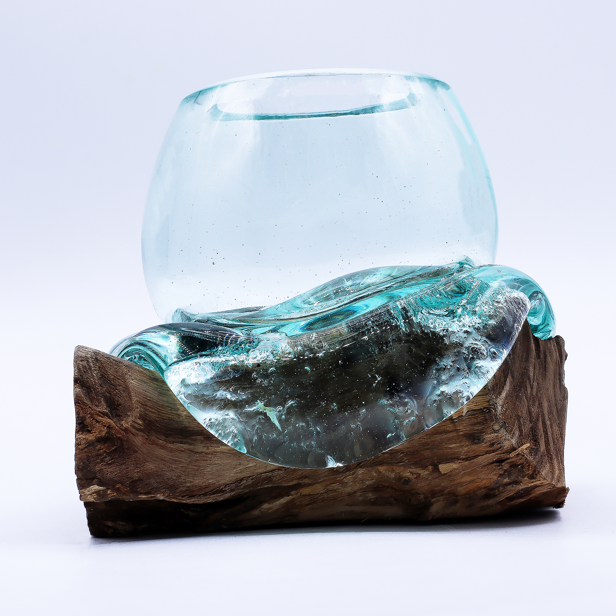 Izrađena na Baliju od recikliranog stakla i održivo nabavljenog drva Gamal, svaki komad oblikovan je pojedinačno dok se vruće staklo izlijeva preko prirodnog drveta, stvarajući organsku bazu koja savršeno pristaje. Rezultat je predivna, jedinstvena skulptura koja istovremeno služi kao praktična vaza.
