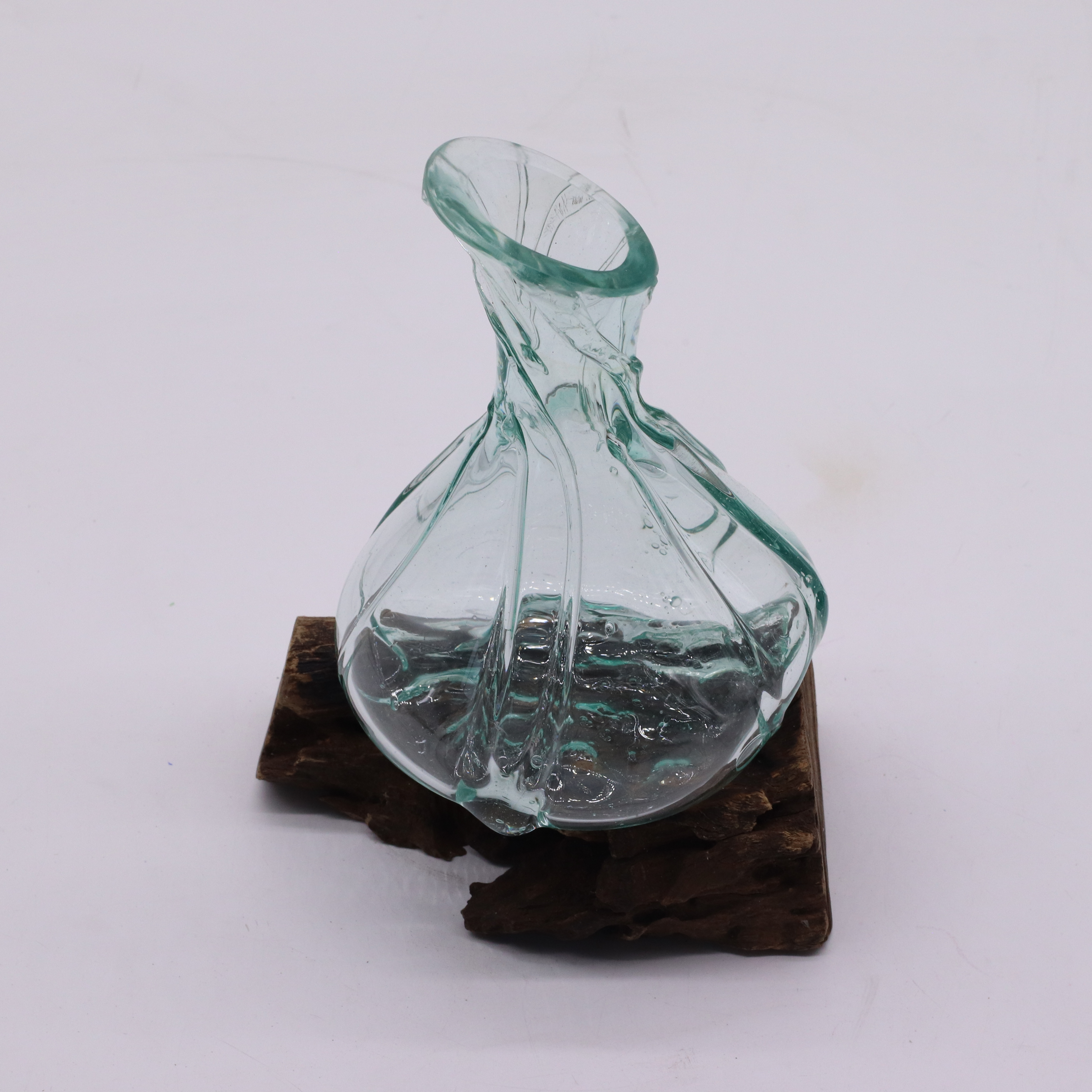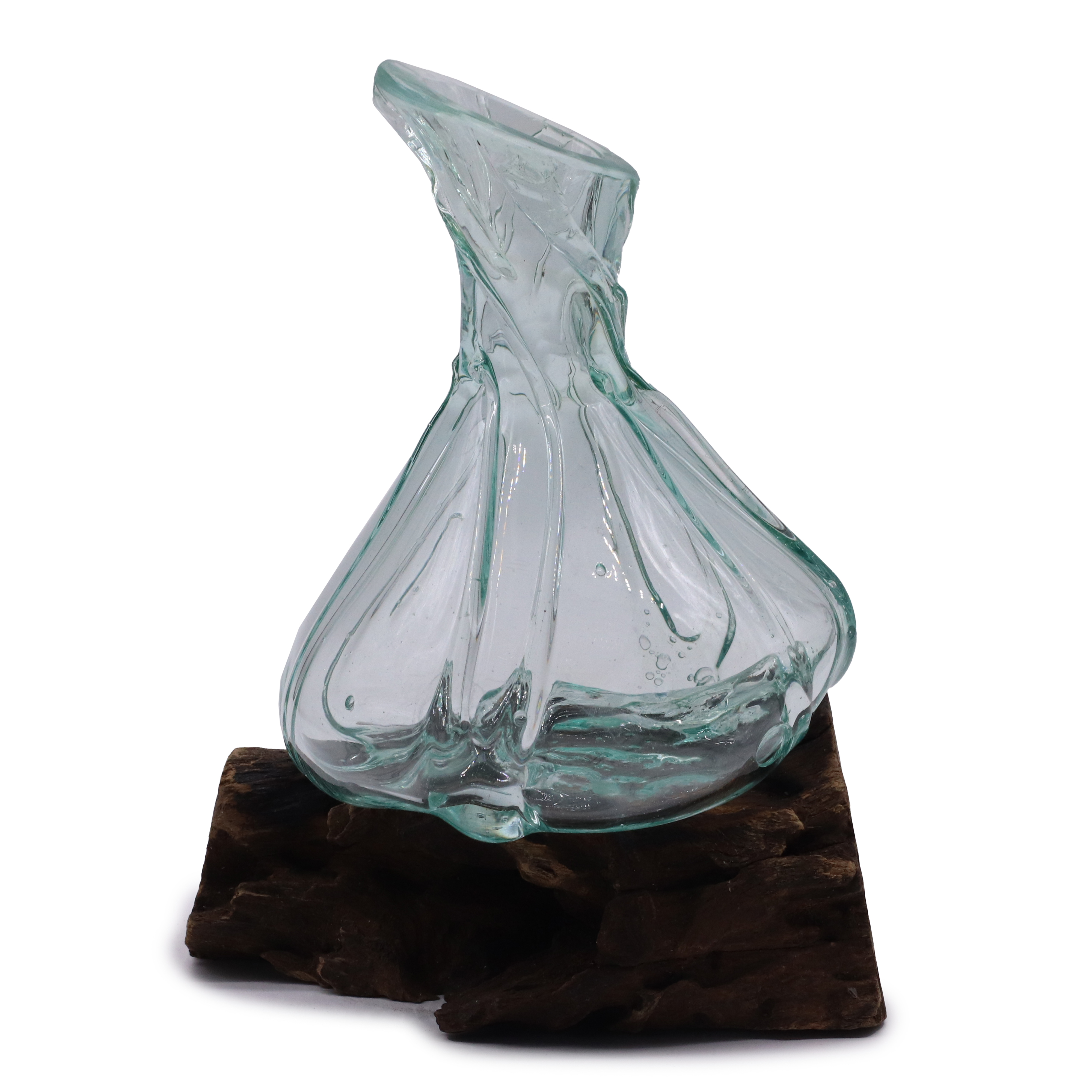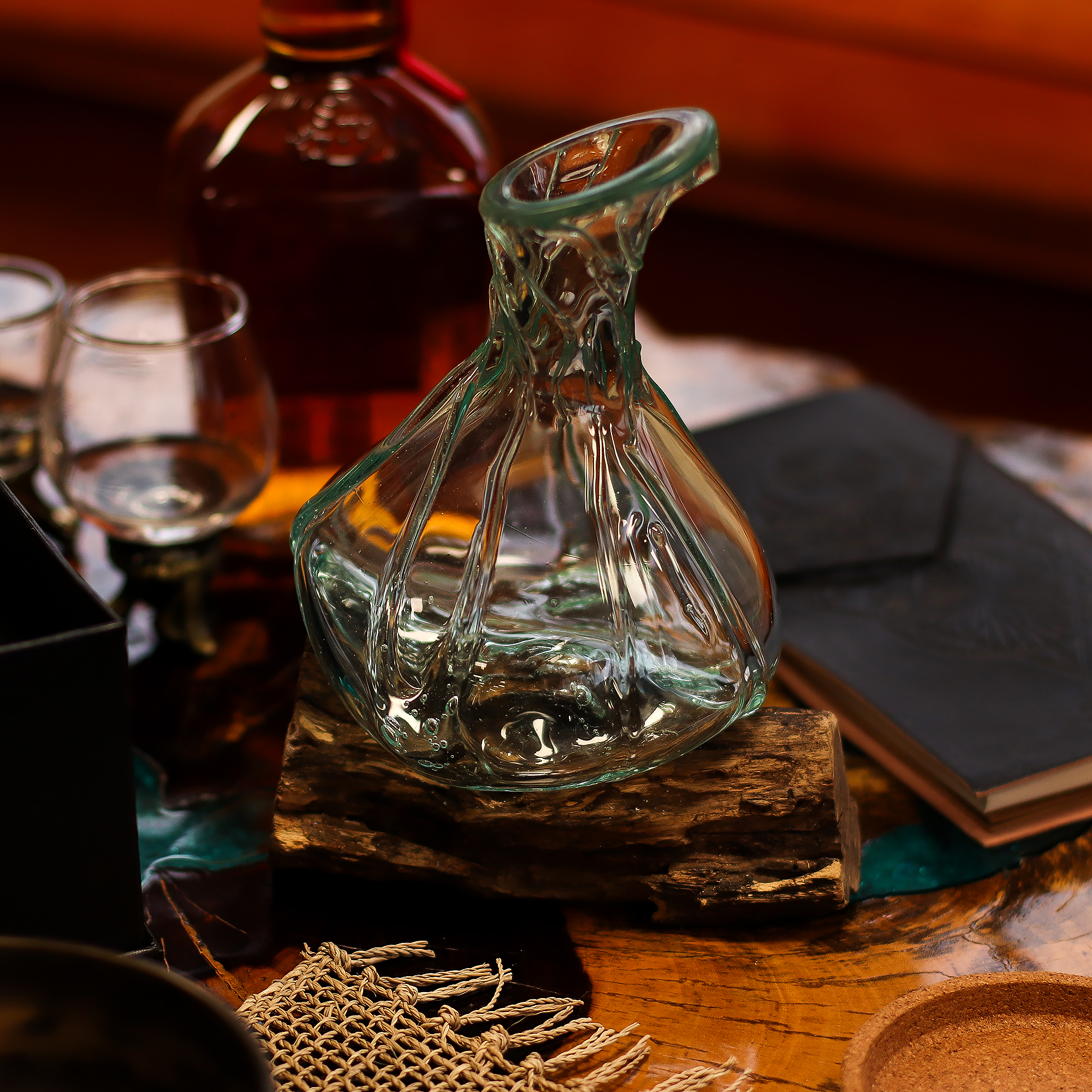 Svaki je dekanter ručno puhan od recikliranog stakla i elegantno počiva na prirodnoj drvenoj bazi, oblikovanoj tijekom hlađenja stakla kako bi se osiguralo savršeno pristajanje. Njegov elegantni oblik i organska tekstura čine ga idealnim kao funkcionalni dekanter za vino ili vodu, ali i kao isključivo dekorativni predmet.