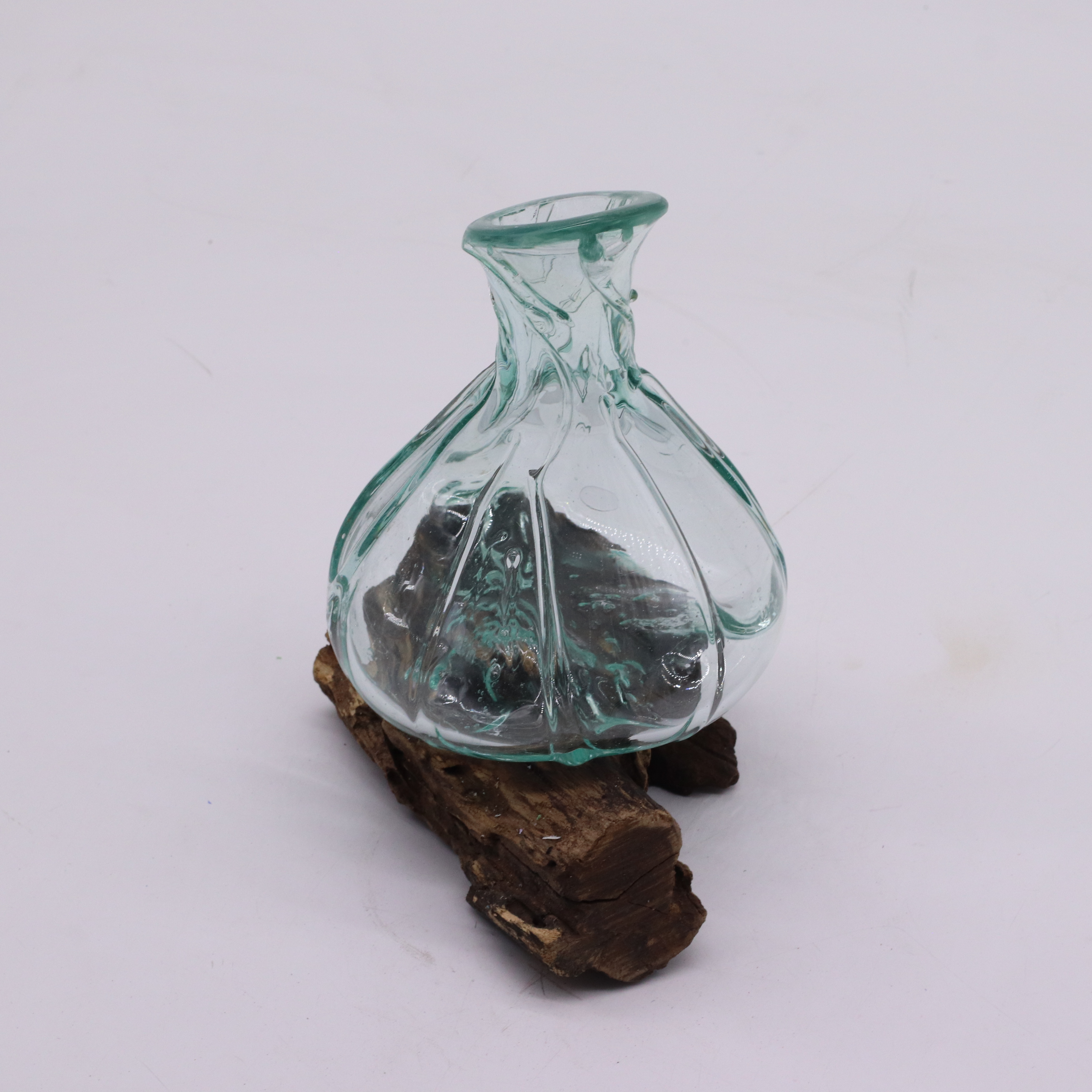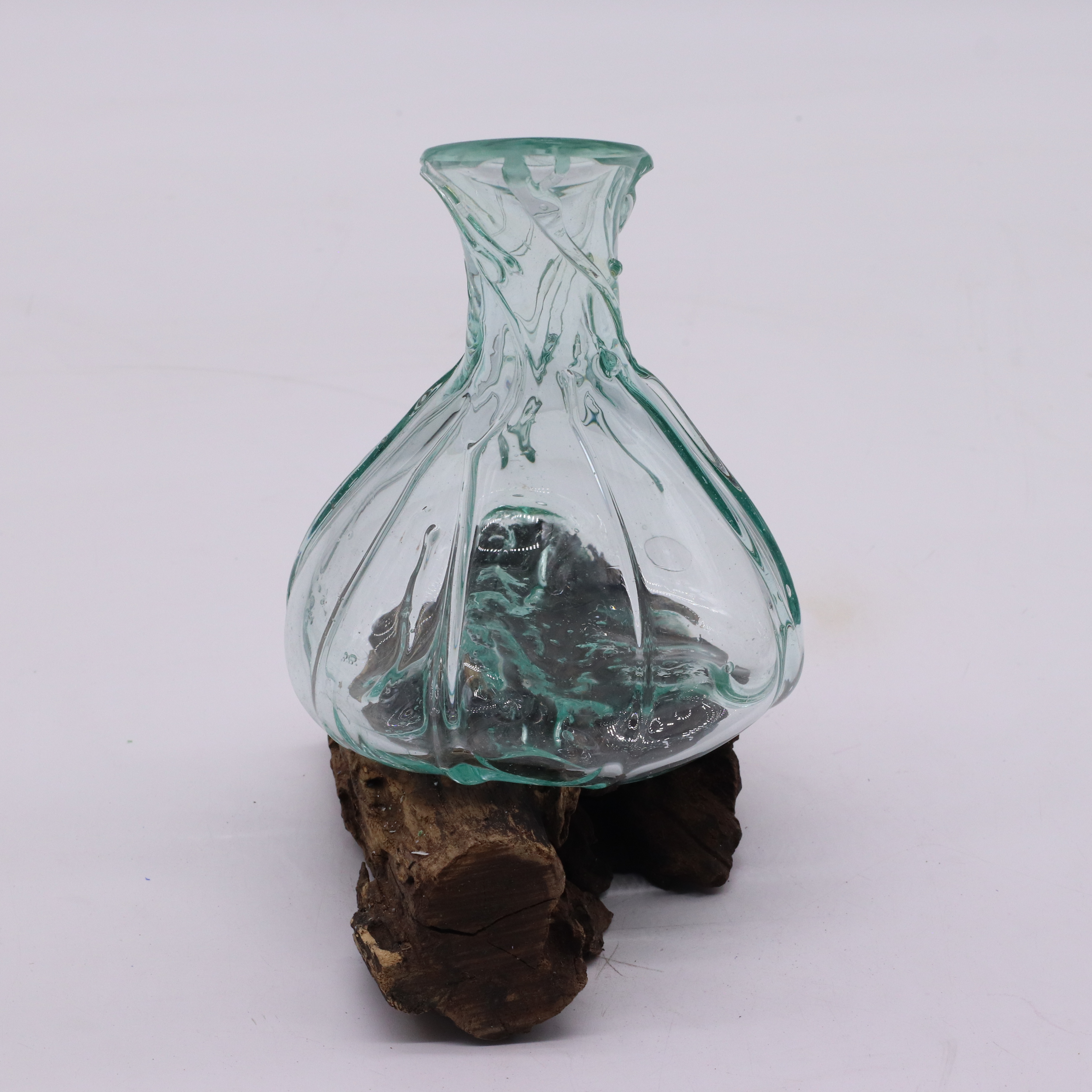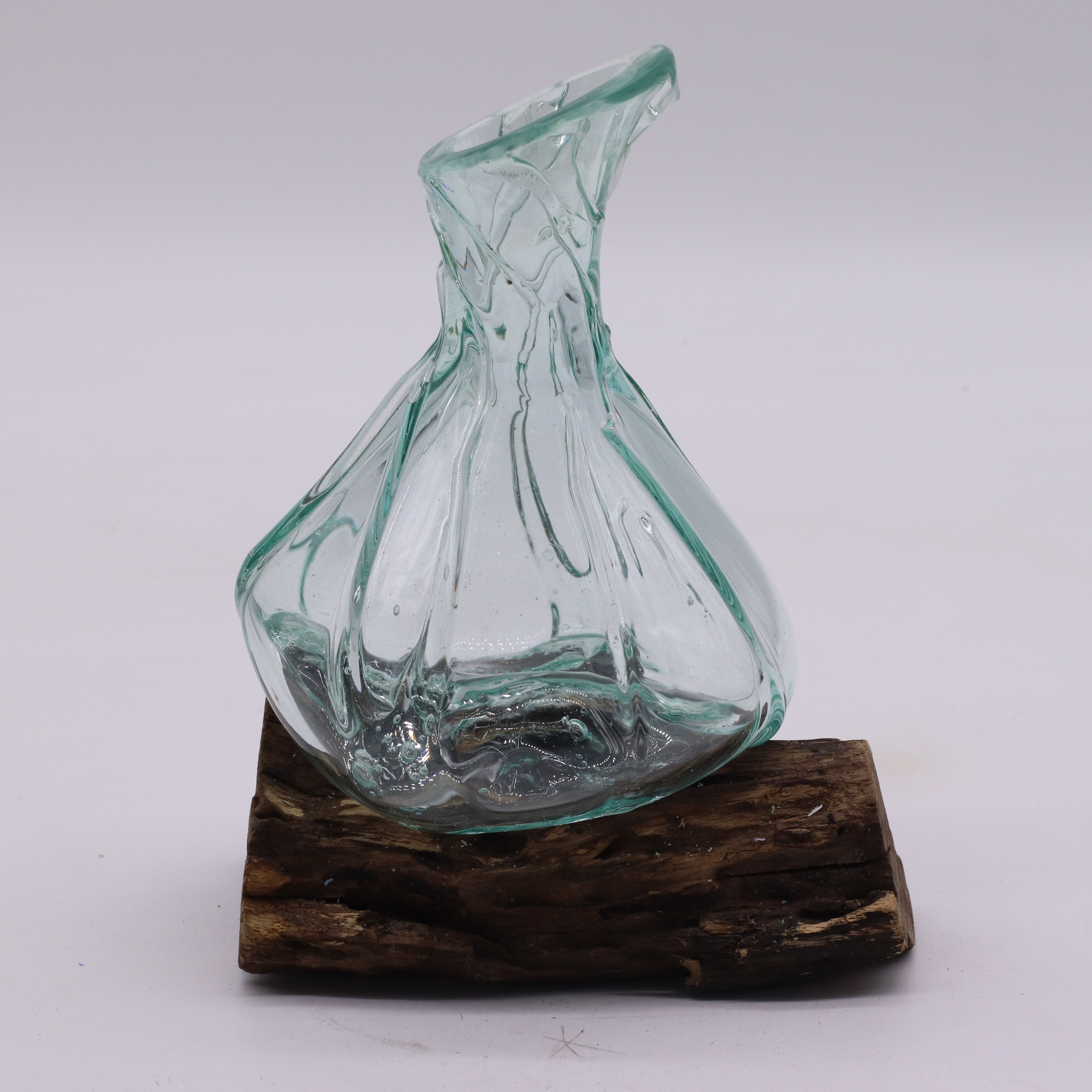Svaki je dekanter ručno puhan od recikliranog stakla i elegantno počiva na prirodnoj drvenoj bazi, oblikovanoj tijekom hlađenja stakla kako bi se osiguralo savršeno pristajanje. Njegov elegantni oblik i organska tekstura čine ga idealnim kao funkcionalni dekanter za vino ili vodu, ali i kao isključivo dekorativni predmet.