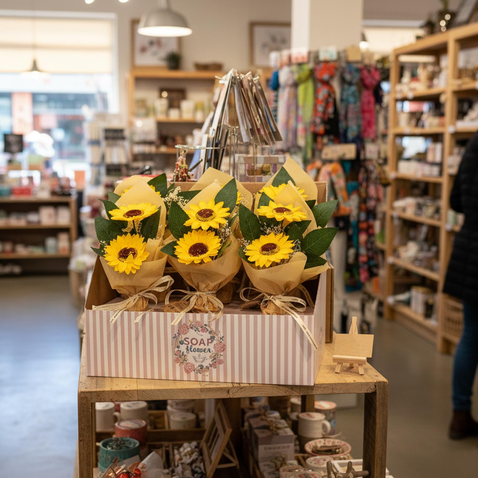 Svaka izložbena kutija sadrži šest prekrasnih sapunastih buketa, svaka s dva prekrasno izrađena suncokreta, pažljivo aranžirana i omotana - spremna za prodaju izravno iz kutije.