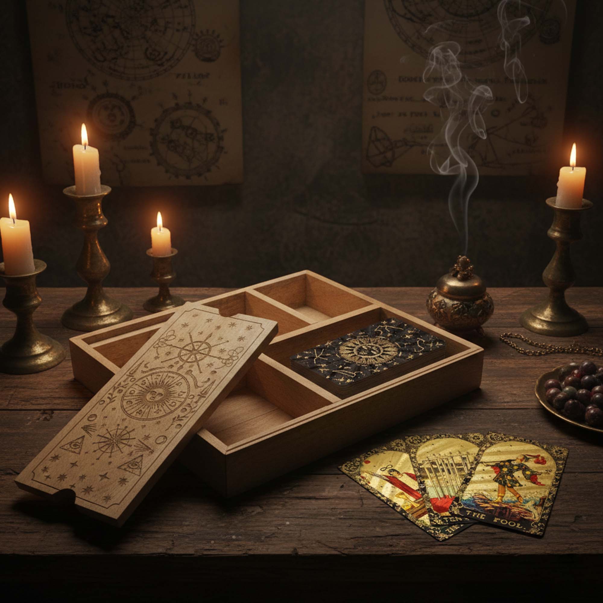 Svaka kutija za tarot kombinira funkcionalno spremanje karata s izraženom dekorativnom vrijednošću. Pažljivo oblikovani pretinci omogućuju sigurno i organizirano čuvanje tarot karata, dok gravirani poklopci i topla, prirodna struktura drva čine proizvod spremnim za izlaganje odmah po otvaranju. Ugrađeni držač za tarot kartu omogućuje postavljanje odabrane karte tijekom tarot čitanja, rituala ili svakodnevne refleksije.