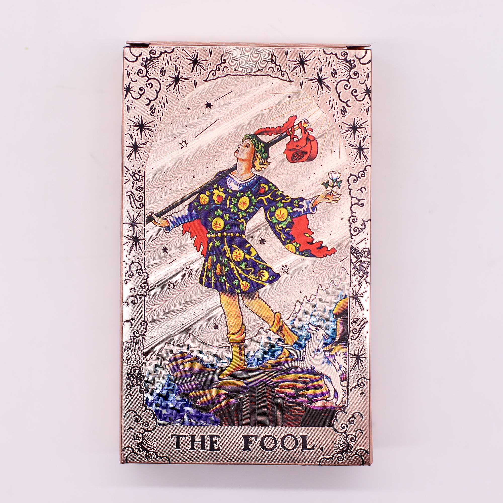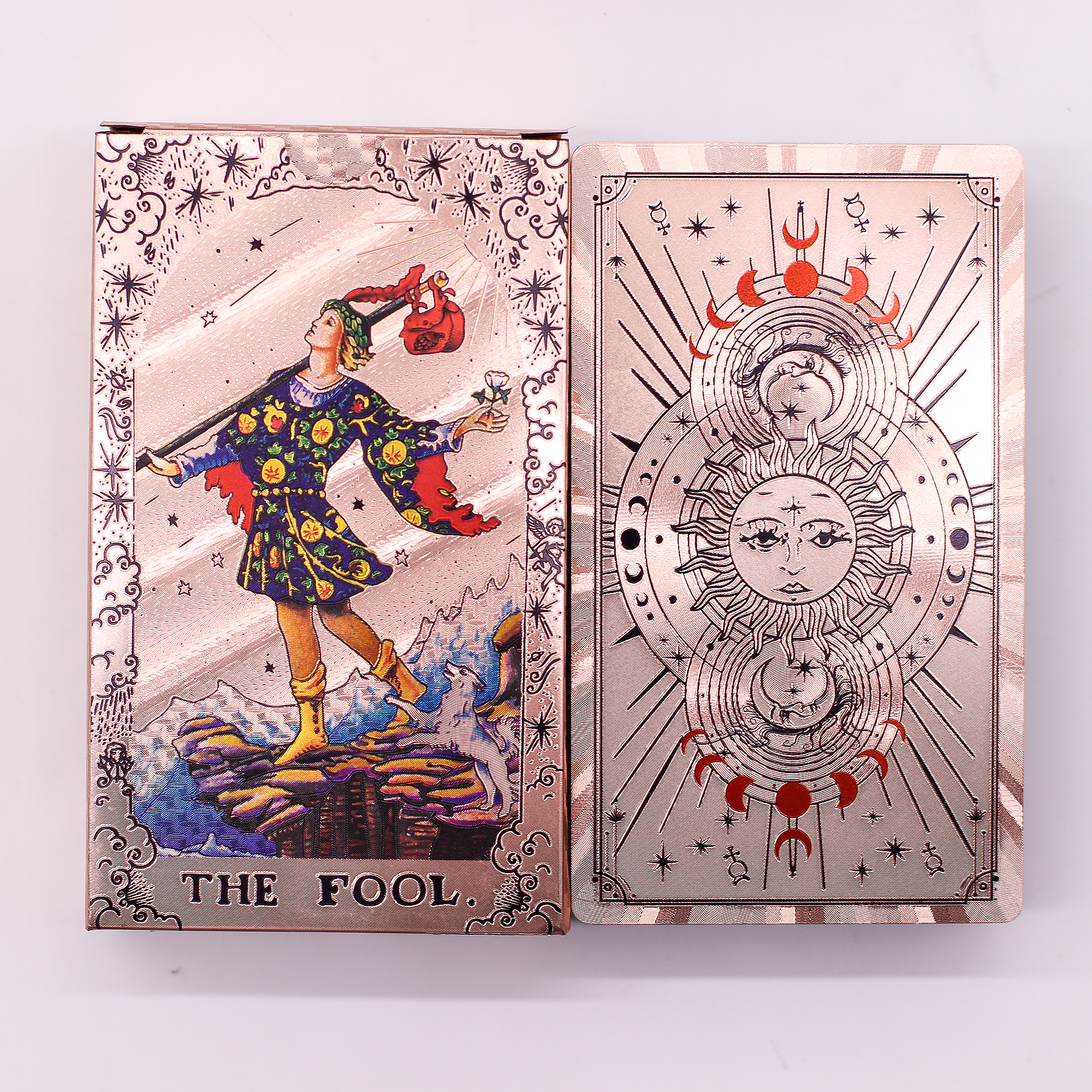 Set Tarot Karata s Rose Gold Folijom – Mjesečeve Faze unosi sjajnu dubinu u vaša čitanja kroz blistav dizajn folije. Svaka karta odražava mjesečeve tonove, dodajući nebeski dodir bezvremenskoj umjetnosti tarota.