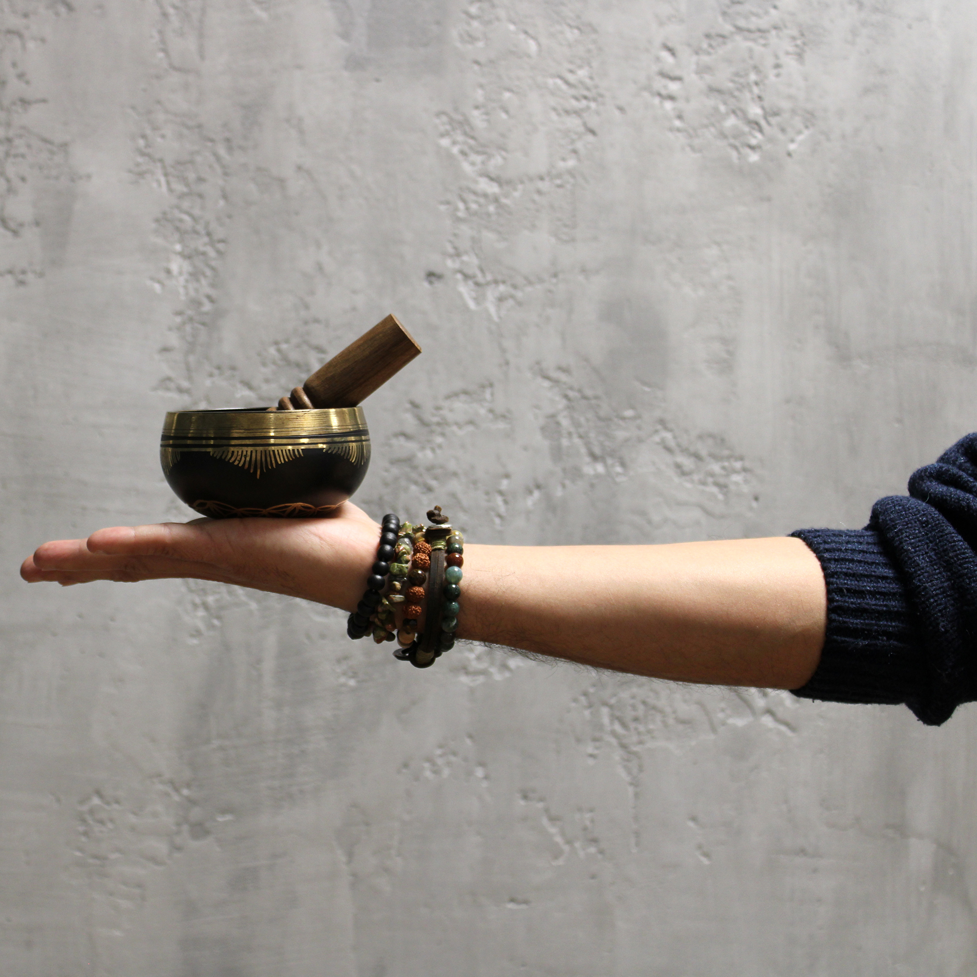 Set dolazi s drvenim čekićem za stvaranje umirujućih vibracija, jastučićem za stabilnost i torbicom za sigurno prenošenje i pohranu.