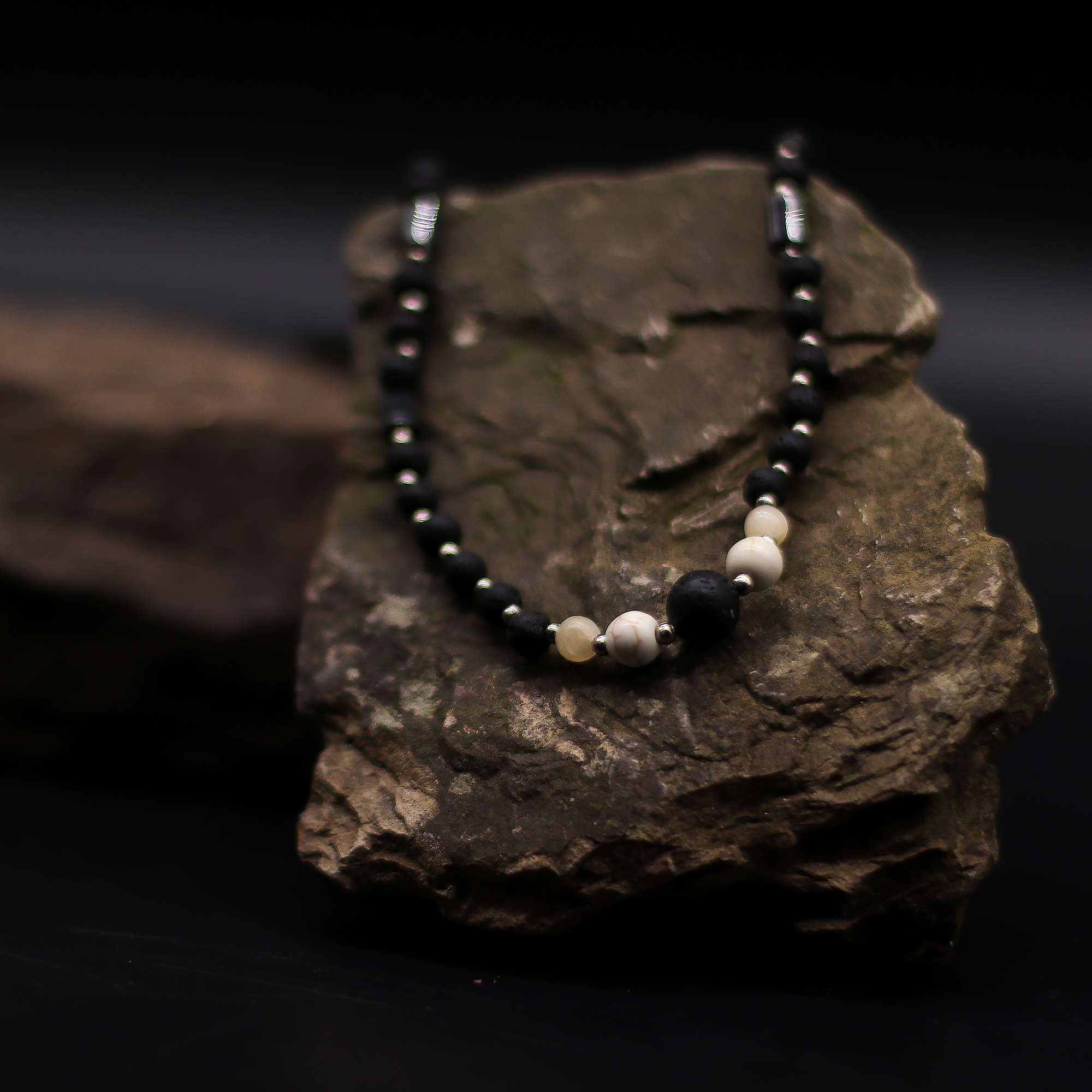 Prirodne perle od lave simboliziraju uzemljujuću energiju, dok ukrasni kamenčići odražavaju raznolikost i povezanost među kulturama. Riječ je o smislenom komadu za svakoga tko cijeni pripadnost i zajedničko čovječanstvo.