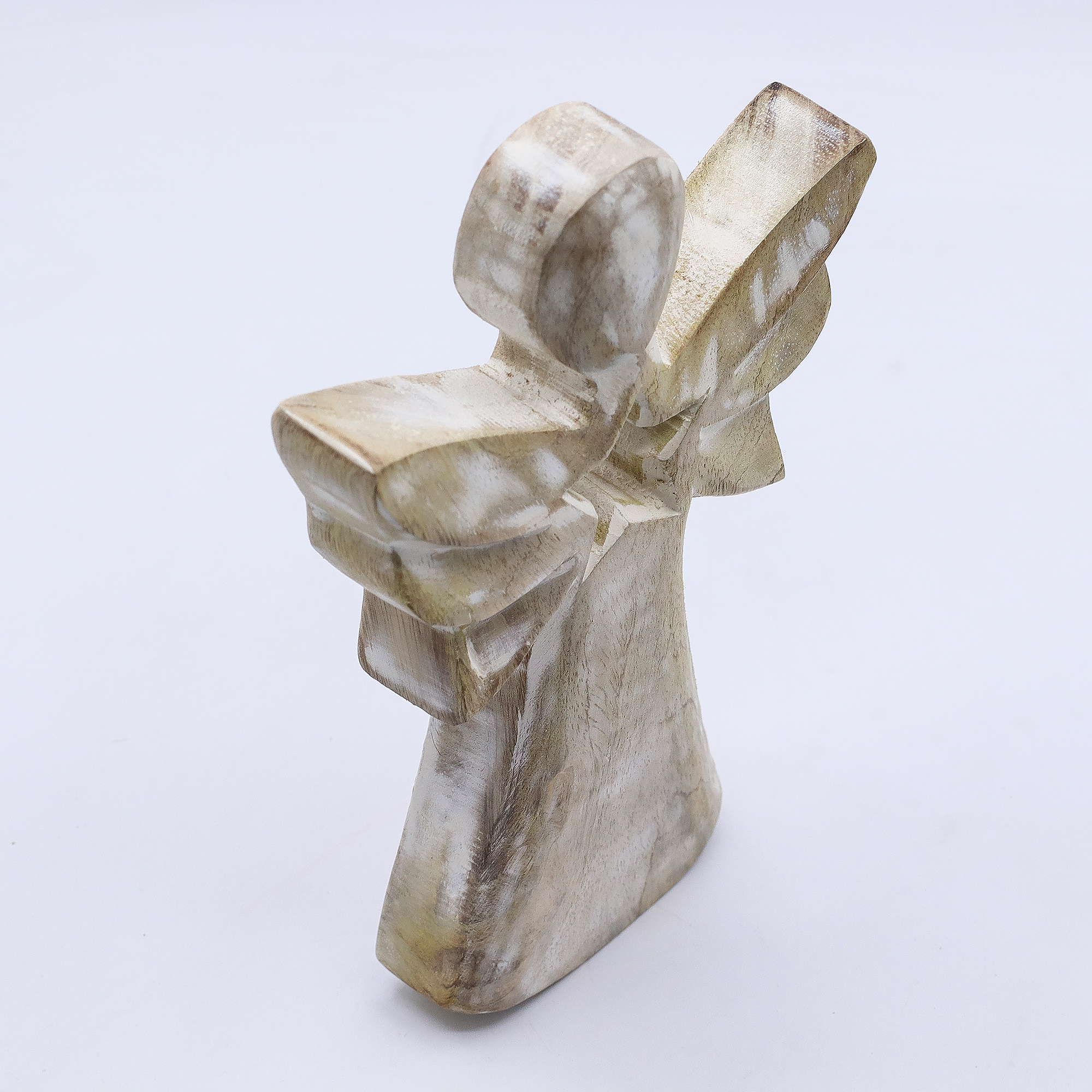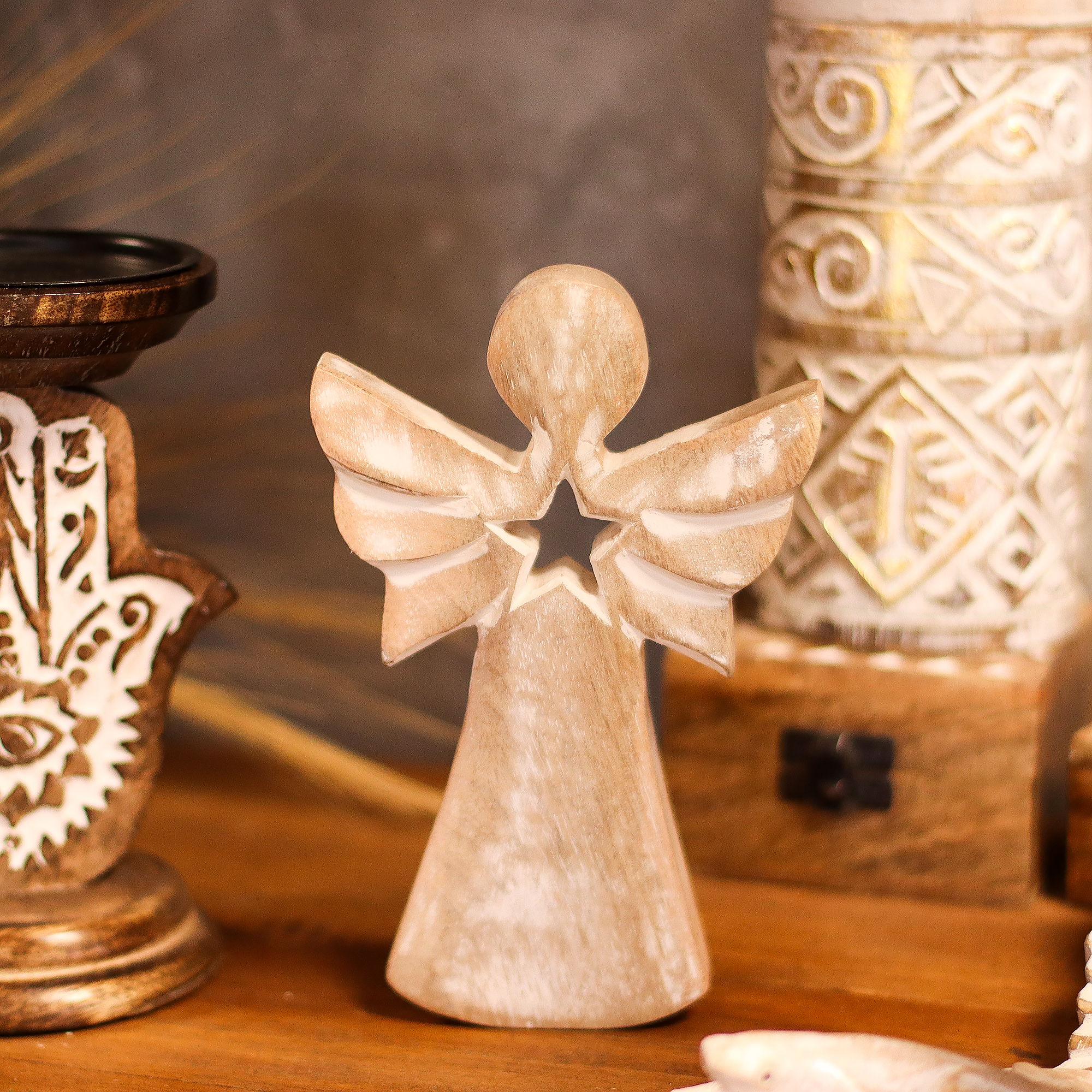Ručno izrezbaren u Indiji od održivog drveta manga, ima nježnu bijelu završnu obradu sa šarmantnim detaljem izrezane zvijezde. Svaki komad je pošteno trgovan i izrađen pojedinačno. Ovaj svestrani anđeo prekrasan je dekorativni naglasak, značajan poklon ili popularan predmet za božićne izložbe.